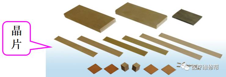 晶片是探头中最重要的部件,用于接收电脉冲产生机械超声振动,完成声电和电-声转换工作。其几何形状和尺寸是根据诊断要求来设计的,上、下电极分别焊有一根引线,用来传输电信号;探头中一般有多个晶片构成,有的将振子沿直线排列为一行,组成线阵探头;有的将振子沿弧形排列,构成凸阵探头;有的将振子成矩阵排列,构成矩阵探头等多种多元超声换能器。