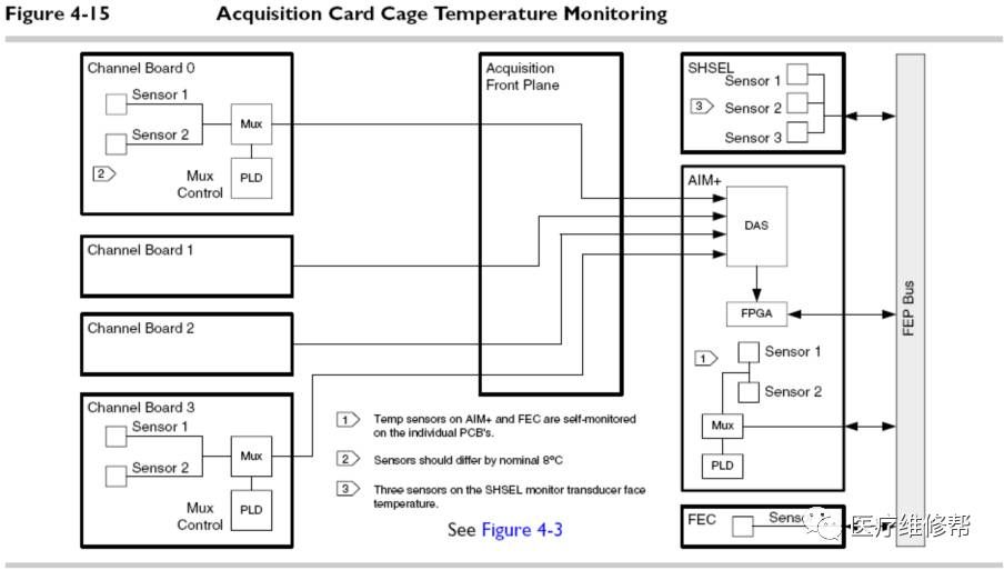 前端机箱中的4片Channel,NAIM/AIM,每一片电路板上都有2个温度传感器。分别位于上下两端。FEC板上只有一个温度传感器。在NAIM/AIM上有温度监视电路FPGA。通过FEC将机箱各个扳上温度的数字值送给HOST中的AVIO CAD。