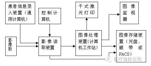 计算机X线摄影系统(CR),是一种将X线摄影图像数字化的图像处理系统。其过程就是将感光的带有X线摄影图像信息的图像板(IP)放入读取器中经过激光激发,光电转换变成数字图像,再经计算机后处理,得到理想的影像诊断用图像。