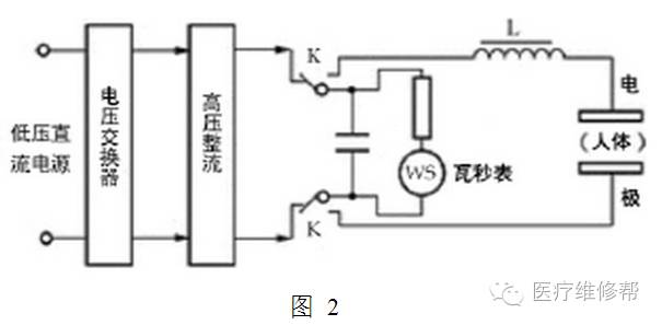 电压变换器将直流低压变换成脉冲高压,经高压整流后向储能电容C充电在电容中储存一定的能量。除颤治疗时,控制高压继电器 K动作 ,将储能电容 C、电感 L及人体 (负荷)串联接通,使之构成 RLC (R为人体电阻、导线本身电阻、人体与电极的接触电阻三者之和)串联谐振衰减振荡电路 ,即为阻尼振荡放电电路,对人体放电。