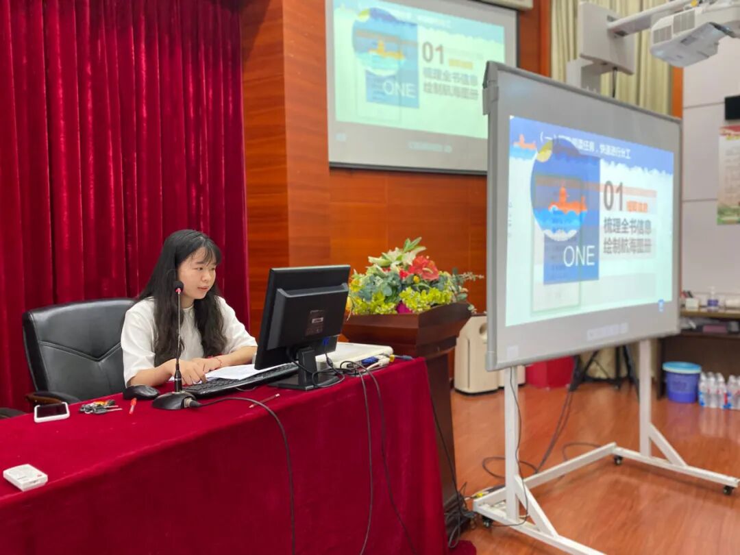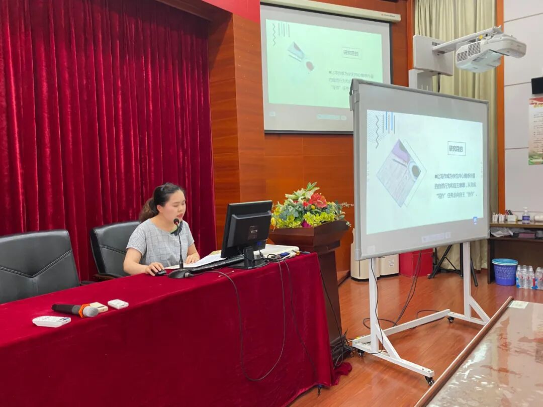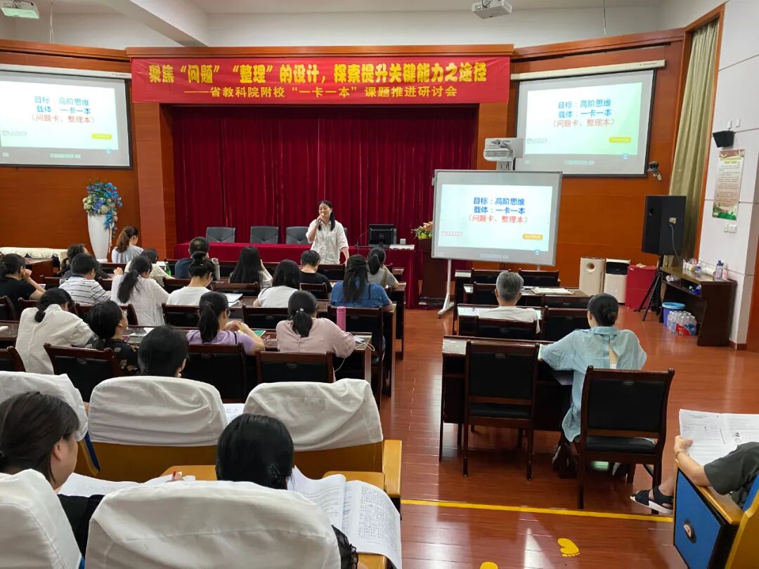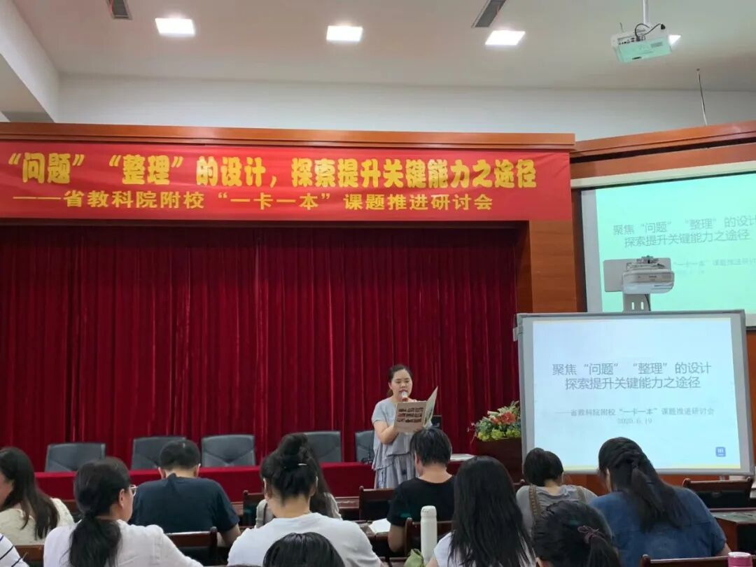芬芳六月,鸟语蝉鸣。为推进“一卡一本”课题,提升教学研究水平,促进教师专业成长,6月19日,省教科院附校召开了主题为“聚焦‘问题’‘整理’的设计 探索提升关键能力之途径”研讨会。中学语文组的老师们分享了自己的相关研究,干货满满,让我们开启这趟智慧的旅程吧! 张雯昕老师的主题是“创新整理本:整本书深度阅读探索”。她以《海底两万里》阅读学习为例,向老师们分享了在引导学生进行深度阅读活动中的“问题”和“整理”的设计。 张老师在三次活动中利用递进式问题卡和多样化整理本引导学生完成阅读学习任务。通过这三次活动,张老师利用“一卡一本”,最终引导学生进行了整本书的深入阅读。 *************************************************************** 周颖老师分享了她在写作教学过程中对问题卡和整理本的实践。周老师借助问题卡,让学生体验作品背后的创作过程;同时也借助整理本帮助学生学会自己梳理写作思路和写作技巧。 “一卡一本”在周老师的写作课中,起到了提供学习支架的作用,帮助学生开展深度学习,养成良好的思维习惯。  卢程佳老师将“一卡一本”应用于“活动·探究”单元的教学中,使用组合式的问题卡帮助学生撰写演讲稿。在模拟演讲中,卢老师鼓励学生先进行自主整理,随后进行小组和班级整理,最后形成班级的整理本。 “一卡一本”的实践,激发了学生主动学习的积极性,推动了高阶思维的发展。 柴乐忆老师从“提升学生自主习得能力,构建知识系统”的角度出发,分享了自读课中对已学阅读方法的实践,教读课中知识点框架构建,将凌碎变得规整,将散乱变得有框架。从不同方向对整理本实践的尝试,也给在座的各位老师今后的教学实践提供了参考。 “教而不研则浅,研而不教则空。”研讨会的最后,唐宇红校长倾情总结。唐校长强调,通过“一卡一本”为载体,最终达到培养学生高阶思维的目标,为我们指明了方向。 教科研工作作为提高学校发展质量的重要方式,对于学校的发展、教师的成长有着非常重要的作用。我校将继续以课题研究为抓手,从教学实际出发,不断推进课程建设、提高教师素养,真正将科研兴校的目标落到实处。