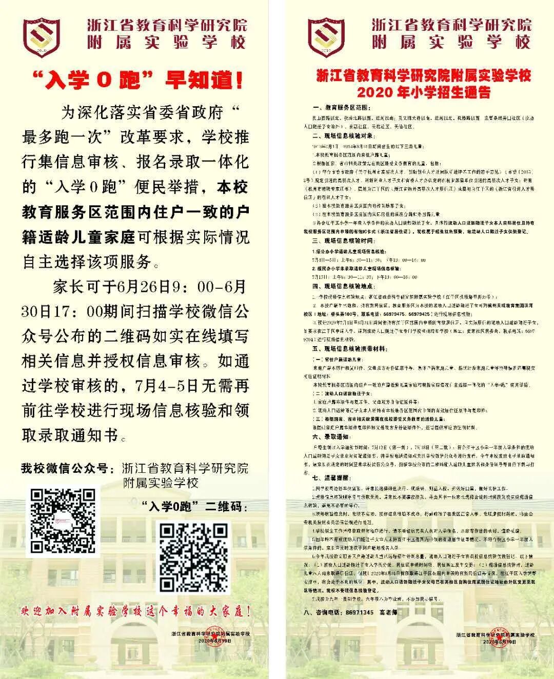 亲爱的一年级预备新生的家长们:如您的孩子符合我校入学要求,请参考《入学“0”跑》、《浙江省教育科学研究院附属实验学校 2020年小学部招生通告》进行操作。