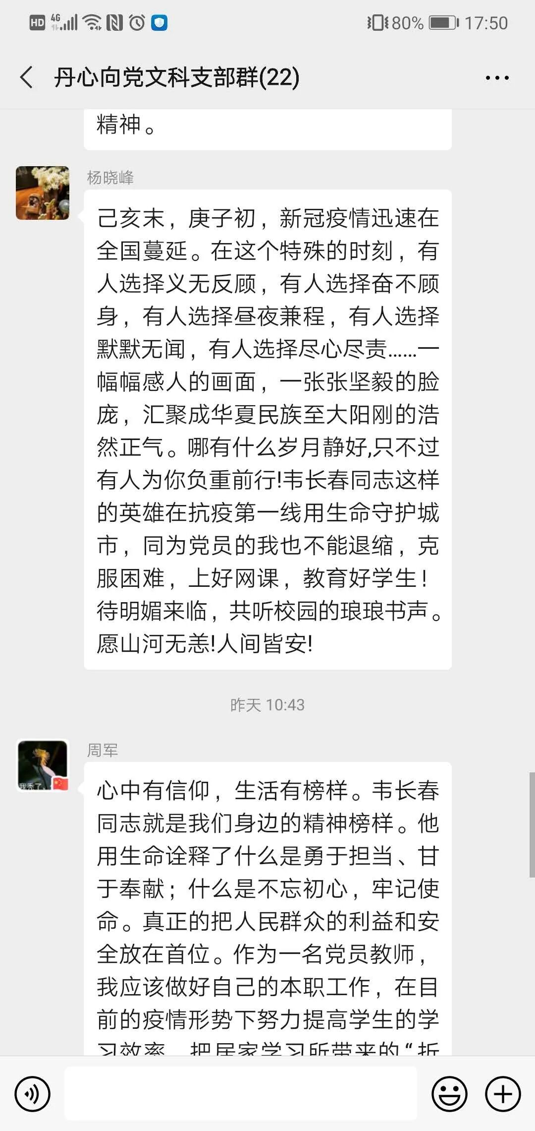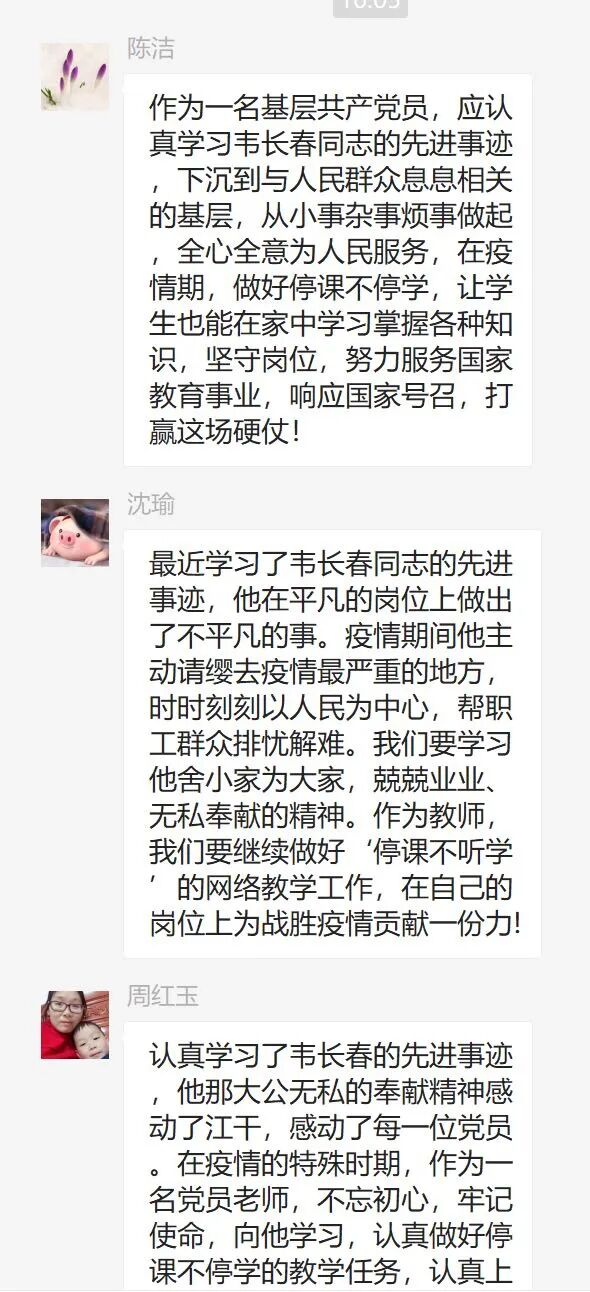 韦长春同志用生命诠释担当,他与千千万万在疫情期间拼命硬干、埋头苦干的“逆行者”们一样,散发出耀眼的光芒,他们是新时代的中国脊梁! 作为附校的党员教师,我们应像韦长春同志一样,在自己的岗位上默默耕耘,对学生负责,上好疫情期间的的每一堂网课,认真解决特殊时期的每一位学生的学习及心理困扰,做温暖的守护者。 |