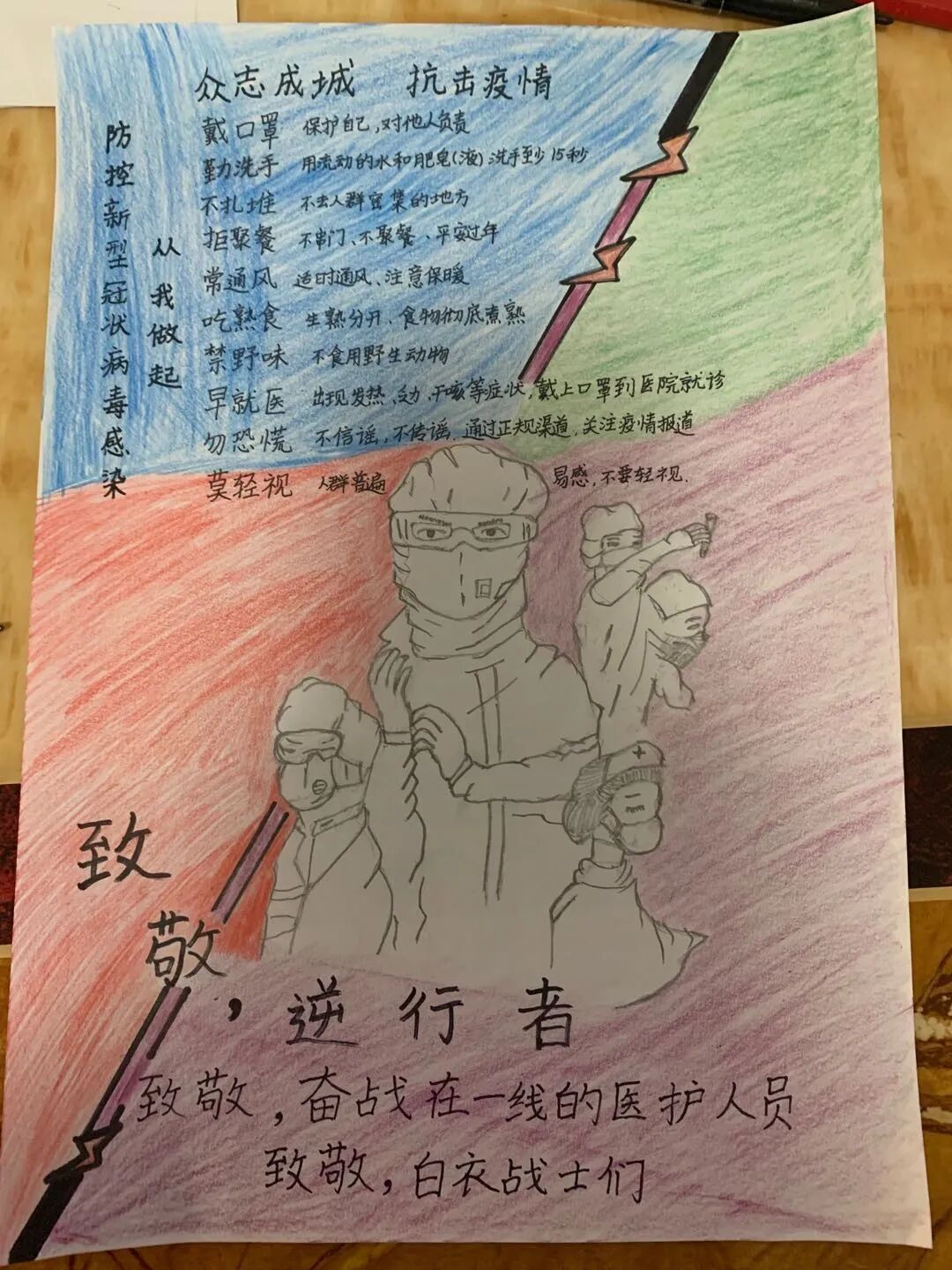 八年级三班的曹文婷这样评价这个春节:“疫情困住了我们的脚步,却没有锁住人与人间的真情”。无论何种形式,附校学子都用他们的行动传递着中国人民的真情。 他们用画笔描绘身影后的力量: