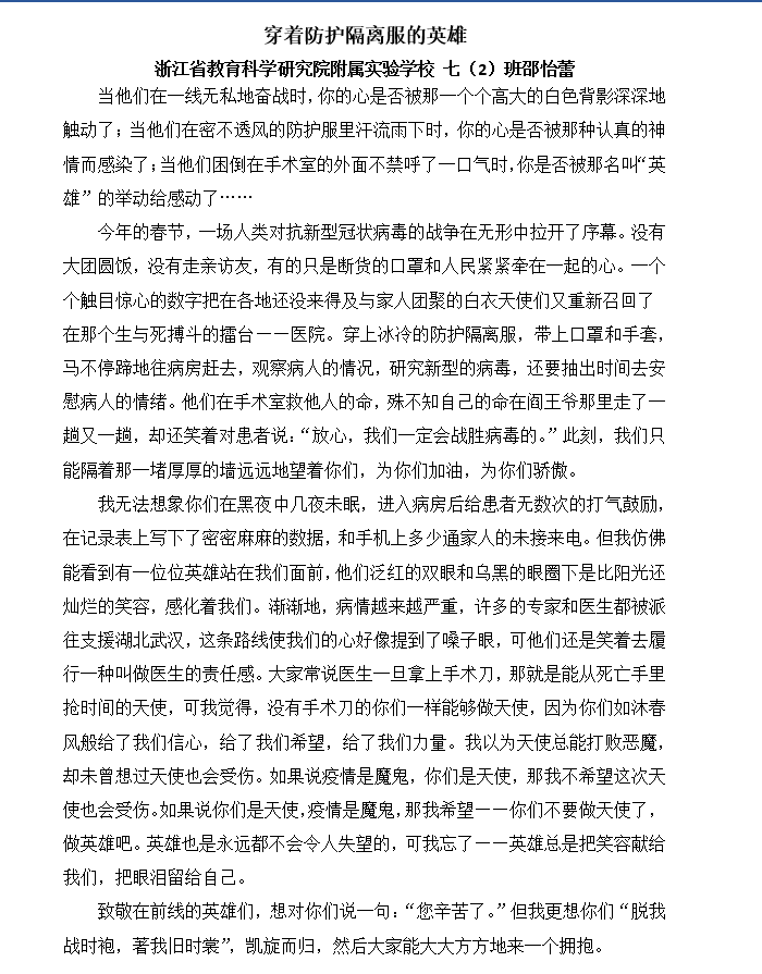 冬将尽,春可期,附校学子在用自己的方式对每位逆行者说:“你们辛苦了!”但我们更想逆行者们能够“脱我战时袍,著我旧时裳”,凯旋而归。 一(1)班章晓娴自创防疫小贯口 八(3)班许荞源为爱发声
