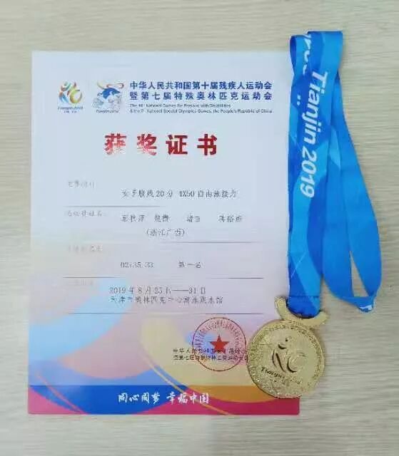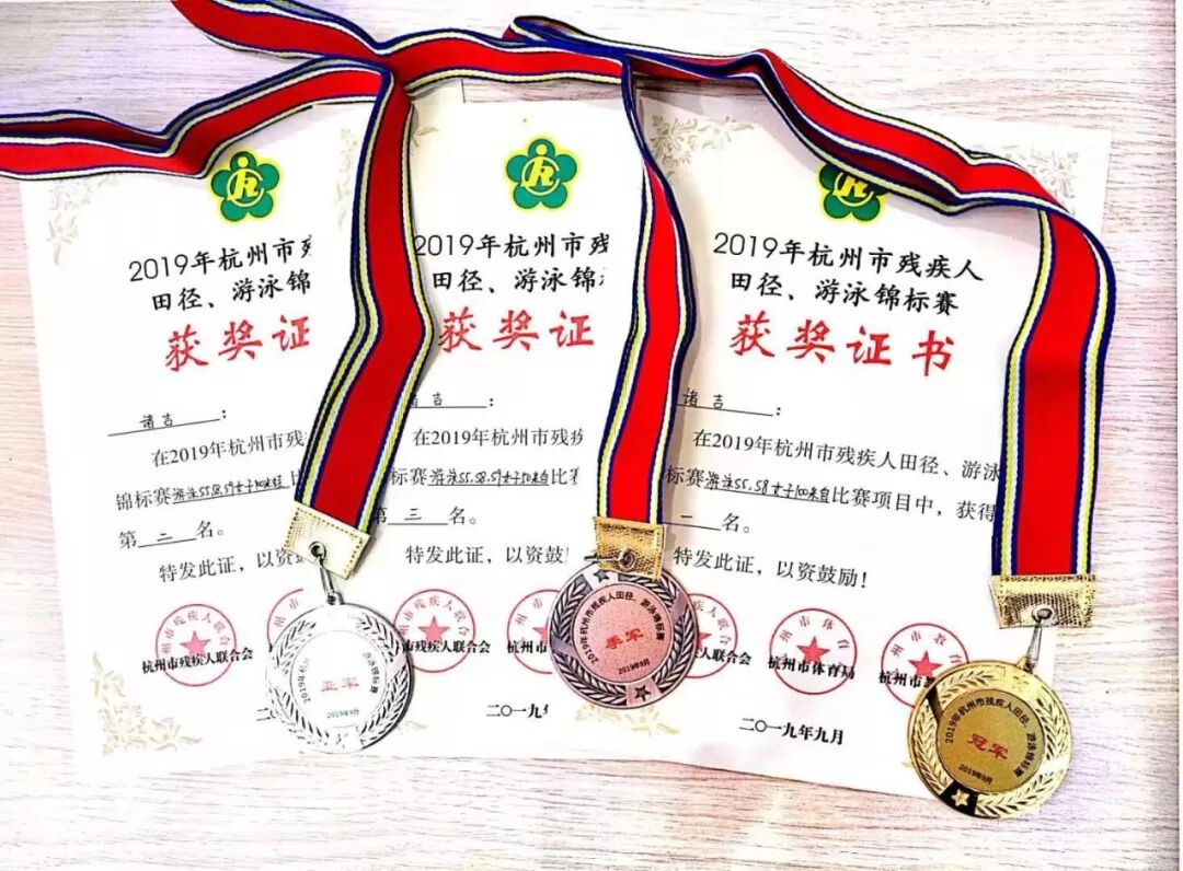 20187诸吉获得杭州市第十届残疾人运动会S10 50m自由泳第三名,SB9 100m蛙泳第三名,S10100m自由泳第三名。