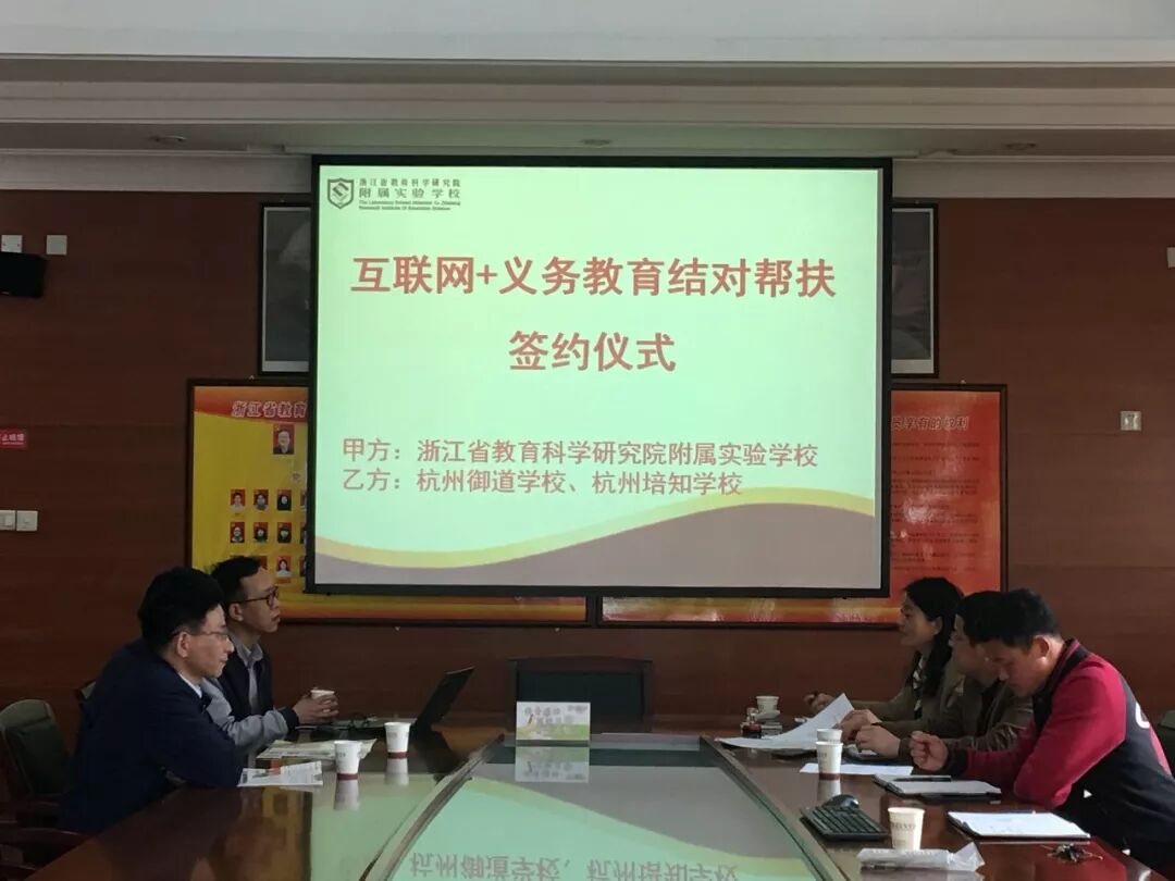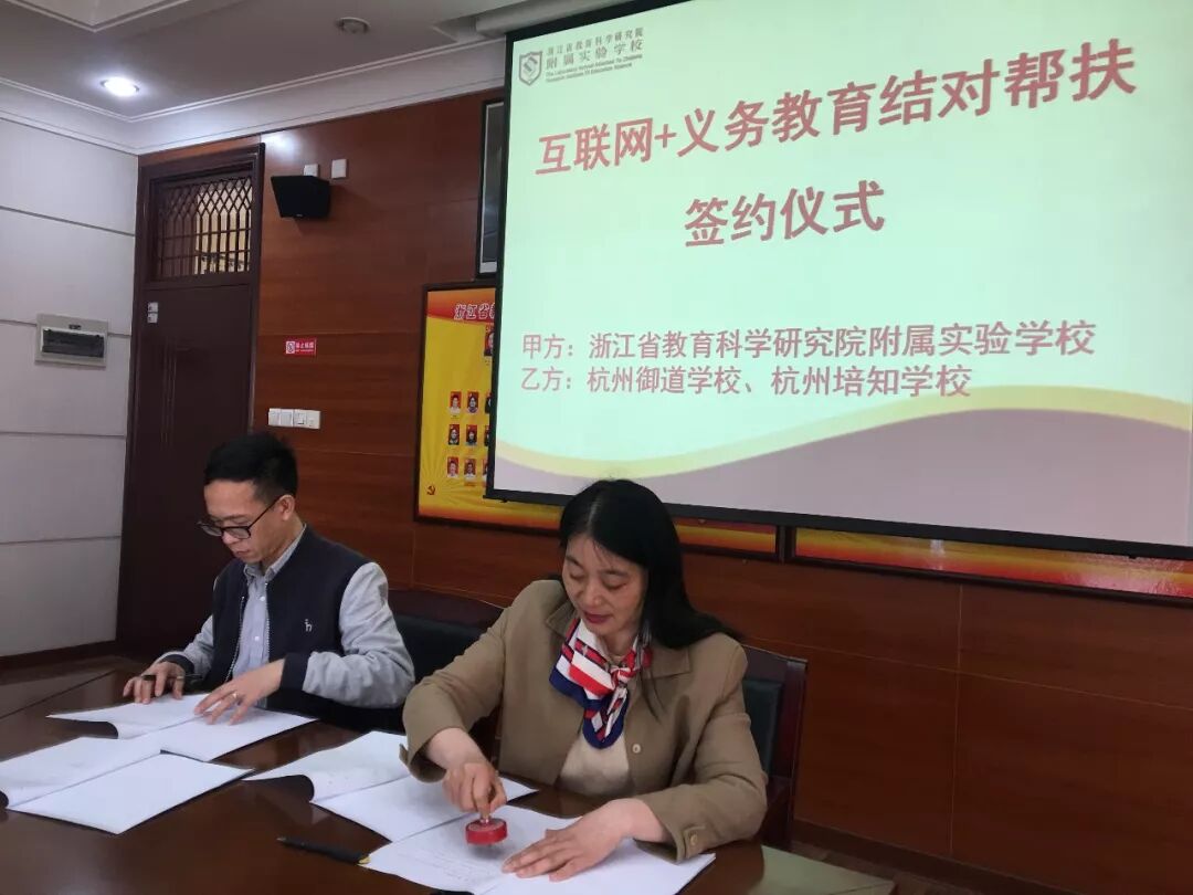 4月15日上午,省教科院附校和杭州御道学校、杭州培知学校进行了互联网+义务教育结对帮扶签约仪式。此次签约活动的开展,紧密了三所学校的联系,也将促进三所学校的互联网+义务教育的研究与实践。