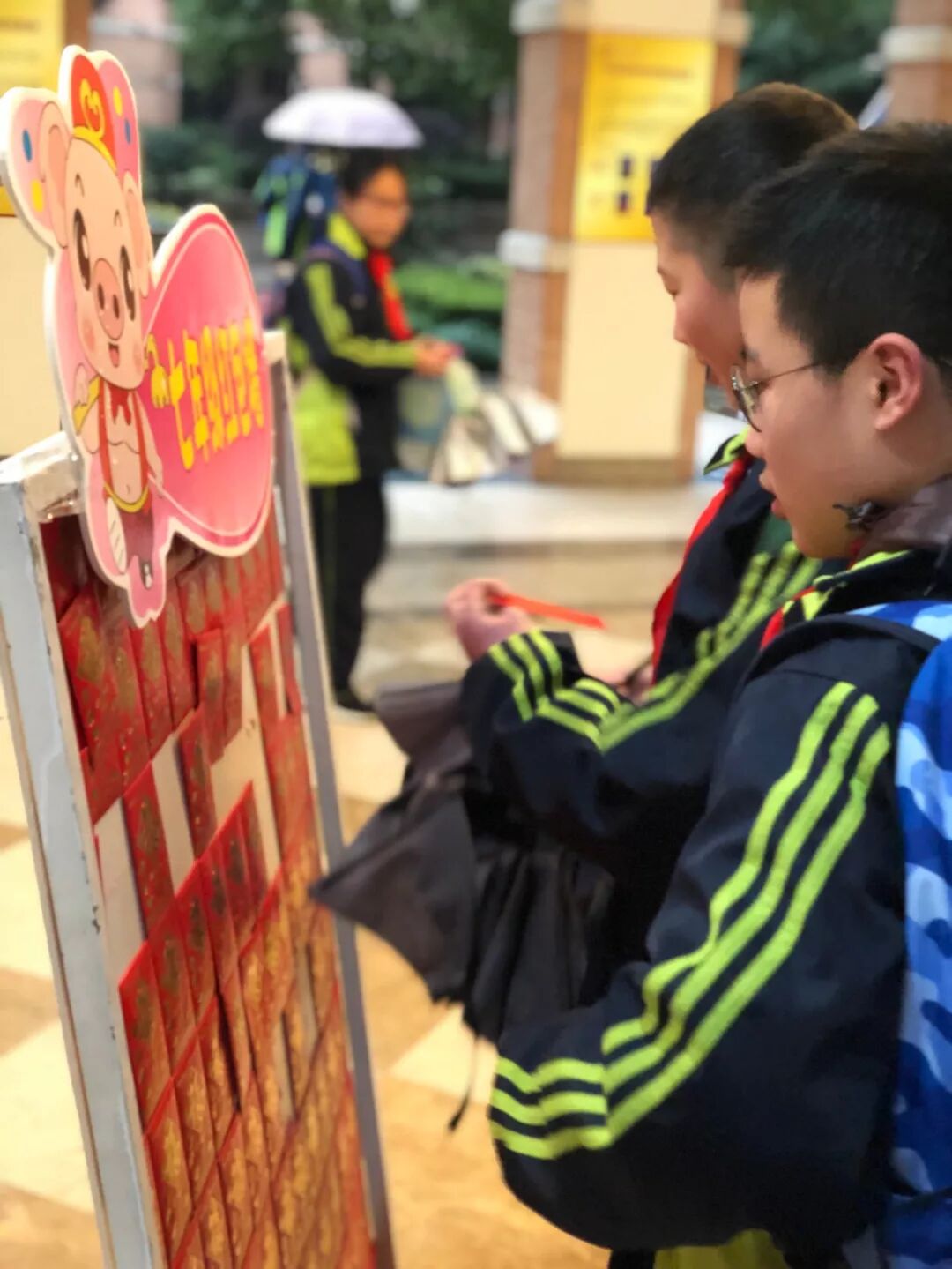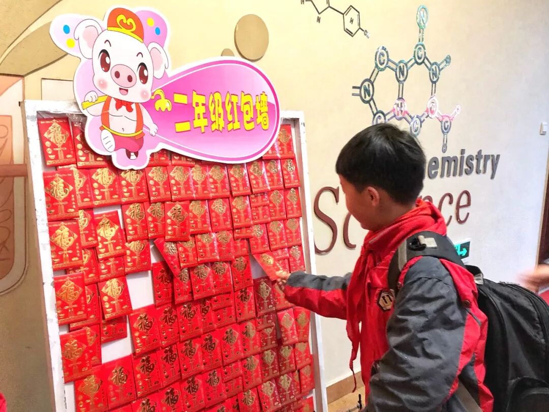寒梅雪中尽,春风柳上归。2月20日报日一早,省教科院附校的一楼门厅里出现了一面面红包墙,上面满满当当坠着许许多多红包,人人有份孩子们满怀惊喜挑选着,在开学第一天收获了许多意料之外的礼物。