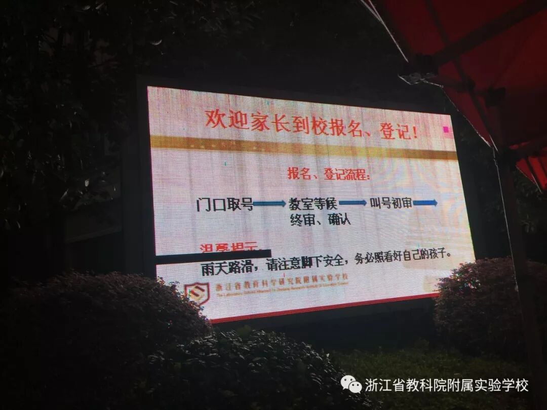 学校门口LED屏幕上显示着报名登记的流程,老师们按照登记报名的路线,贴心地放置好了各种贴心小提示,指示着报名登记的路线,节约家长的时间。