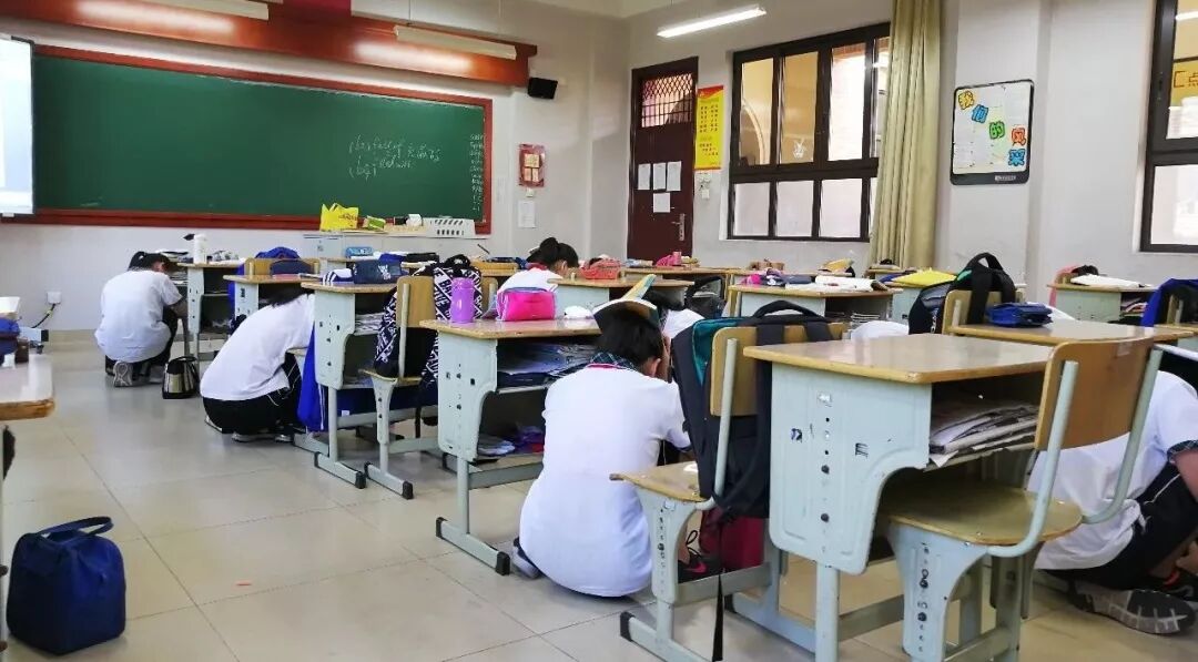 地震警报一响起,各班同学迅速躲在书桌或其它支撑物下,以书本、包等遮头护眼,就地避震