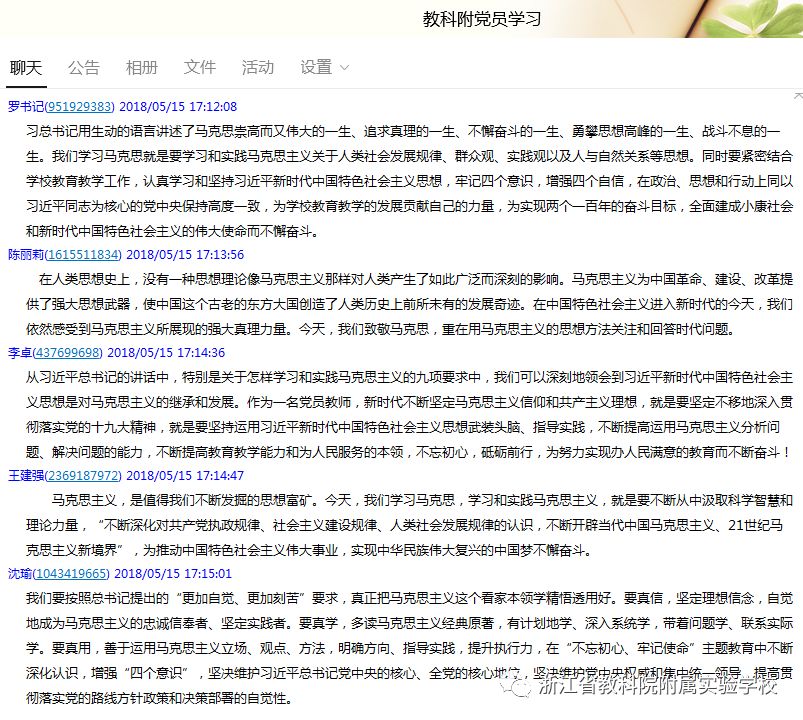 我校党员教师在学习之后纷纷在党员群里发表自己的学习心得: 今天,全体党员怀着崇高的敬意缅怀伟大思想家马克思的生平伟绩,学习习近平总书记纪念马克思诞辰200周年重要讲话。马克思值得我们学习的品质有很多,例如在困境中不屈不挠,树立高尚的理想;求真务实,严谨对待学术研究。在马克思追求真理的过程中,理论指导实践,又在实践中提升理论,从而缔造了伟大的马克思主义。以前我觉得自己该做的就是教书育人,在讲台上上好自己的课,批好学生的作业。现在领悟到,我们应该学习这种严谨治学和研究的态度,把教学理念与实践相结合,迈出智慧教学、有效教学的探索之路!