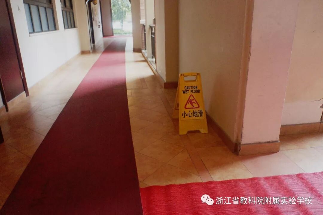 在各楼层和湿滑地带,都放置了提示标牌和警示小旗,时刻提醒师生注意慢行。