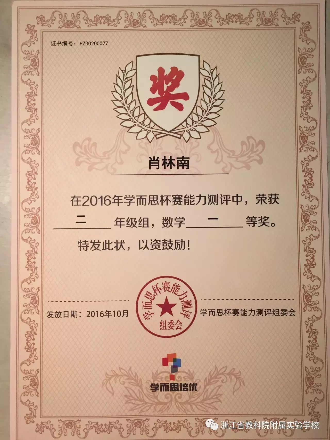 明明有个高颜值,可他偏偏要靠才华。作为班里的学习委员,肖林南学习成绩优异,入学才一年半,就得到了不少荣誉:在2015学年获得第一、二学期“新三好”“全科优秀奖”称号,本学期校期中数学、语文学科竞赛中获得一、二等奖。在刚过去的“附校百星”活动中,更是获得了校“学习之星”的荣誉称号。肖林南特别喜欢数学,在2015学年获得了“数学优秀奖”、“计算小能手”,在这学期的“数学周活动”中获得一等奖。不仅在校内成绩优异,还在校外补充知识,分别取得了2016年“学而思杯赛能力测试二年级组”一等奖以及“学而思计算大赛二年级组”一等奖的好成绩。
