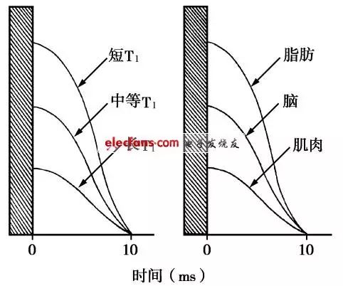 因各种生物组织的纵向弛豫时间约500ms左右,如把重复时间TR定为500ms,则在下1个周期90°脉冲到来时,长T1的组织能量丢失少,纵向磁化矢量(Mz)恢复的幅度低,吸收的能量就少,其磁共振信号的幅度低,
