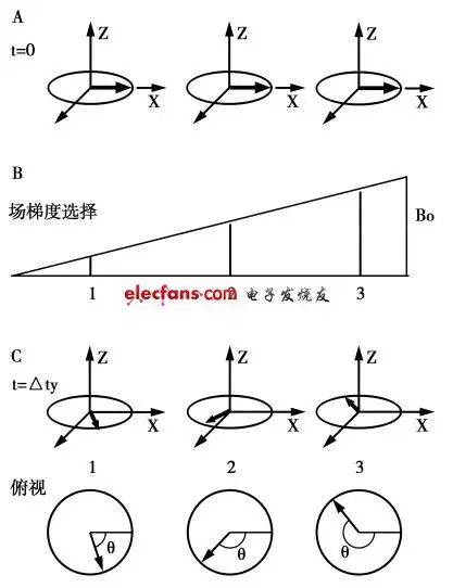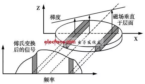 以横轴位(Z)断层为例,于主磁场B0再附加一个梯度磁场Gz,磁感应强度为Bz,则总的磁感应强度为B0+Bz,即沿Z轴方向自左到右磁感应强度不同,根据拉莫尔定律,被检者质子群在纵轴平面上(垂直于Z轴)被分割成一个个横向断面,