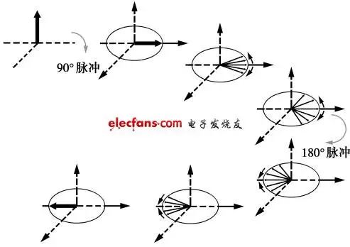 第1个90°射频脉冲使纵向磁化矢量M转到XY平面,由于磁场的不均匀性,构成Mxy值的质子群经受着或强或弱的磁波动,某些质子以较高频率旋进,90°脉冲后同步旋进的质子群很快变为异步,相位由一致变为分散,即失相位,Mxy即横向磁化矢量强度由大变小,最终到零。加入180°脉冲后,使得相位离散的质子群绕X轴旋转180°,此时旋进快、慢不同的质子又以其原速度反向聚拢,使离散的相位趋于一致,Mxy由零又逐渐恢复到接近90