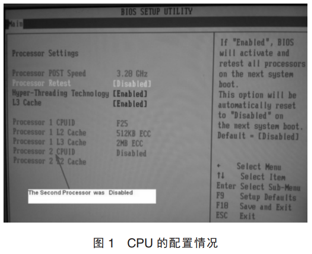 (1)在IG3上连接一个键盘和显示器,通电后将IG3复位,按F2键,检查BOIS内CPU的配置情况(见图1),结果发现第二个CPU处于dis-abled状态。