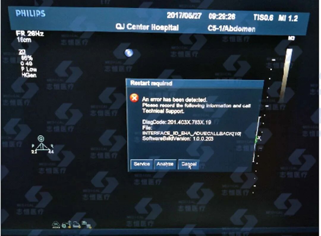 IE Elite机器接插探头开机后出现201报错,超声图像区无回声。