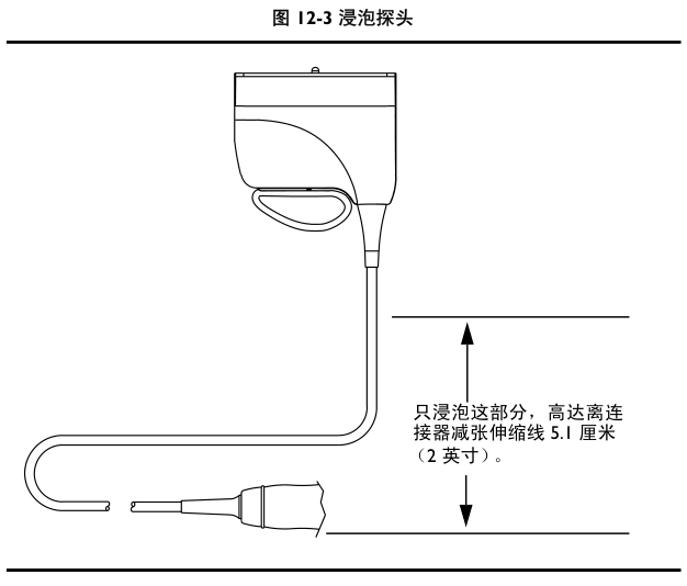 3. 对于您的探头,按图 12-3 中的说明将探头浸泡在适当的消毒液中。遵循消毒剂标签上的说明,确定探头的浸泡时间。不要 使探头的浸泡时间长于消毒强度需要的最短时间。