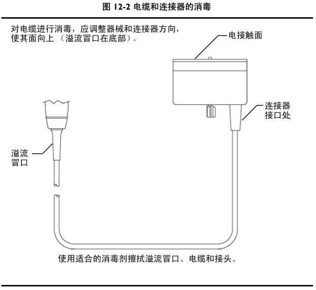 5. 用消毒剂擦拭或喷洒电缆和连接器。对于擦拭时间、溶液浓度以及消毒剂与电缆的接触时间,请遵循消毒剂标签的说明。确保消毒剂浓度和接触时间适合该器械的特定临床使用。确保消毒液不得进入器械或连接器,或接触连接器标签。