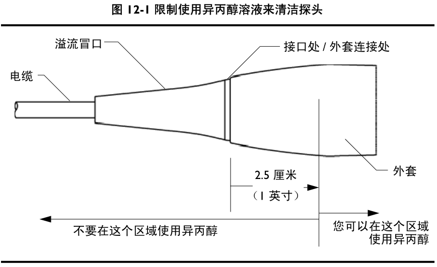 限制在探头上使用 70% 的异丙醇酒精(外用酒精)(图 12-1)。仅可使用异丙醇溶液擦拭离减张伸缩线/护盖接头 2.5 厘米(1 英寸)以外的探头末端区域。不要 在减张伸缩线/护盖接头、减张伸缩线、电缆或 TEE 探头(手柄例外)上使用异丙醇溶液。异丙醇溶液可能造成这些探头部件的损坏。担保或服务合同都不包括这类损坏。