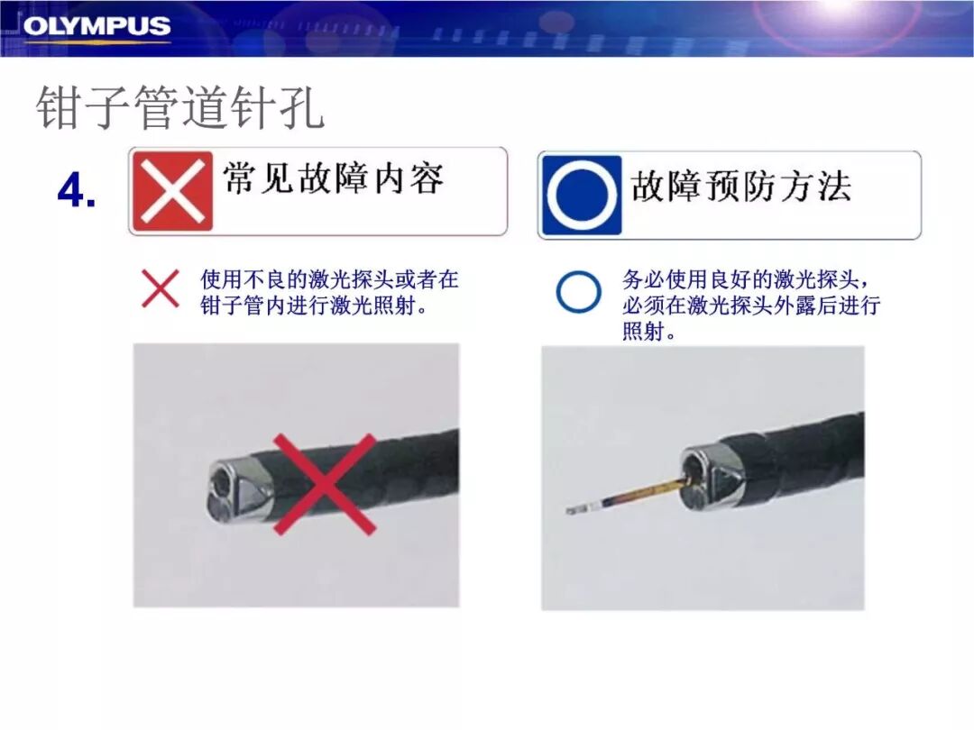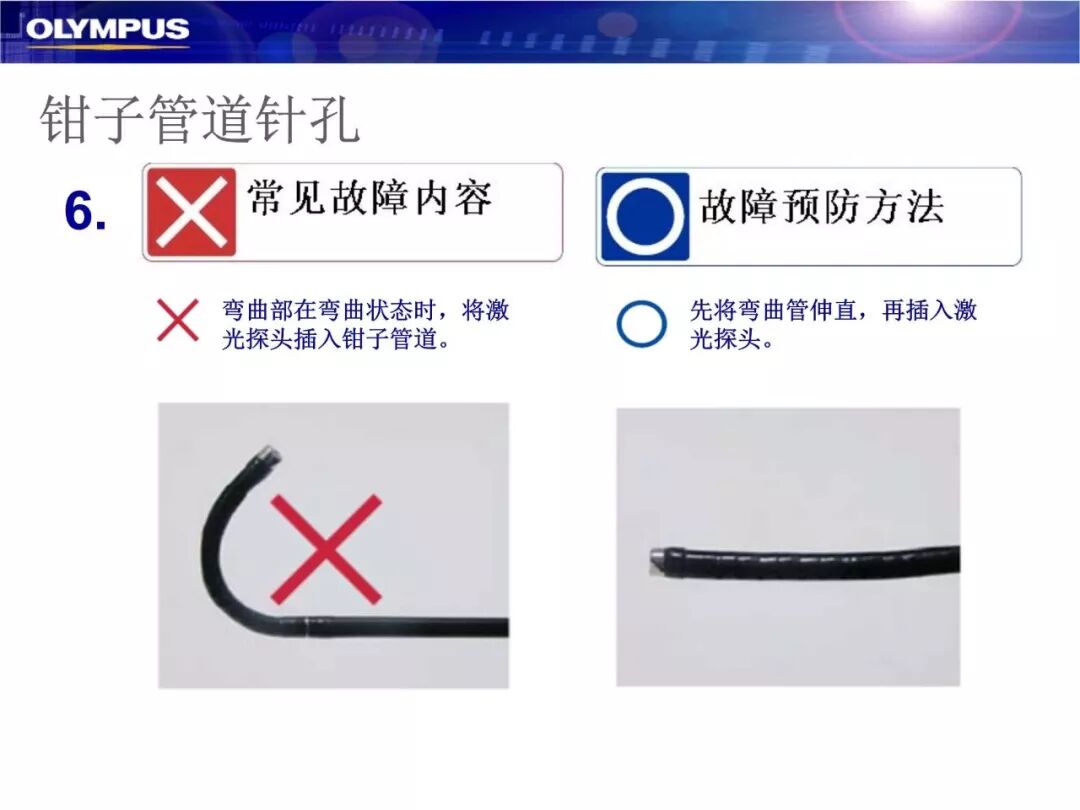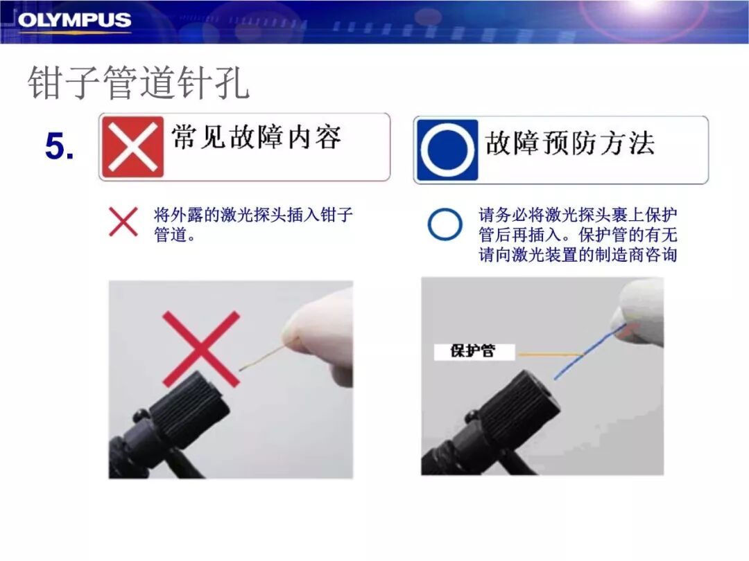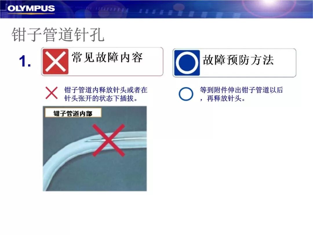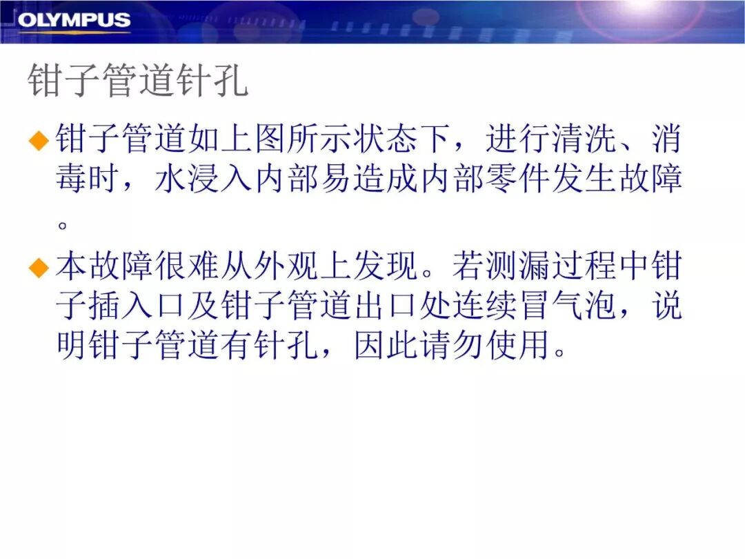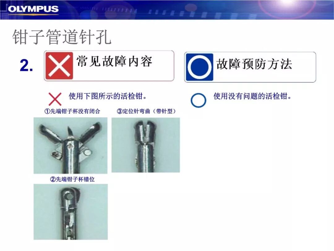 服务建议:在内镜的日常使用中,插入活检钳时,请先将内窥镜打直,确保活检钳为闭合状态,再将活检钳插入到内镜钳道中;若测漏过程中钳子插入口及钳子管道出口处连续冒气泡,说明钳子管道有破损漏水漏气,请立即停止使用内镜。