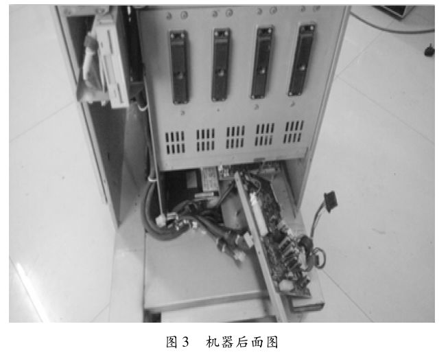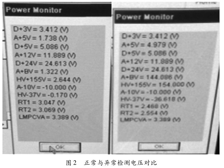 找厂家工程师要了一本引文版维修手册,查阅相关资料,菜单界面上按下“preset”进入维修界面,选择“ma-intenance”,然后选择“Diagnostics”诊断界面,选择“Sys-tem Maintenance”输入密码:oimen,进入系统诊断界面,选择power monitor,查看电压部分的各项参数发现风扇电压A+5V=1.738V(正常值为4.979V),高压电压A+BV=1.322V(正常值为144.086V),这两项参数电压不正常,见图2(正常与异常时电压对比),左边为故障时检测到的电压,右边为正常电压,在测试工具里面选择AUTO-MATIC,all selected测试,发现A02电路板检测时不通过,跟厂家工程师打电话咨询,发现是电源板的问题,电源板电压异常时候会导致A02报错,拆前面四个内六角螺丝拆下前面的挡板盖子,拆后后盖螺丝,小心翼翼的将里面的排线拔掉,拔掉时候注意拍照留下记号,避免恢复机器时候将线连接错误,将故障扩大。
