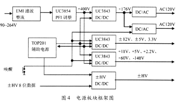 将电源板块从机器后方抽出来(图3),通过分析可知该电源板(见图4)有四个部分构成,最上面的是处理高压部分,第二部分为±5V、±12V、3.3V、整流稳压调整板,第三部分主要是辅助部分,包括功率因素调整,辅助电源,最后一个部分为交流逆变部分。