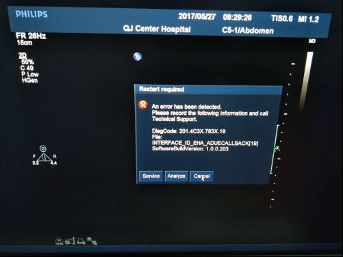 IE Elite机器接插探头开机后出现201报错,超声图像区无回声