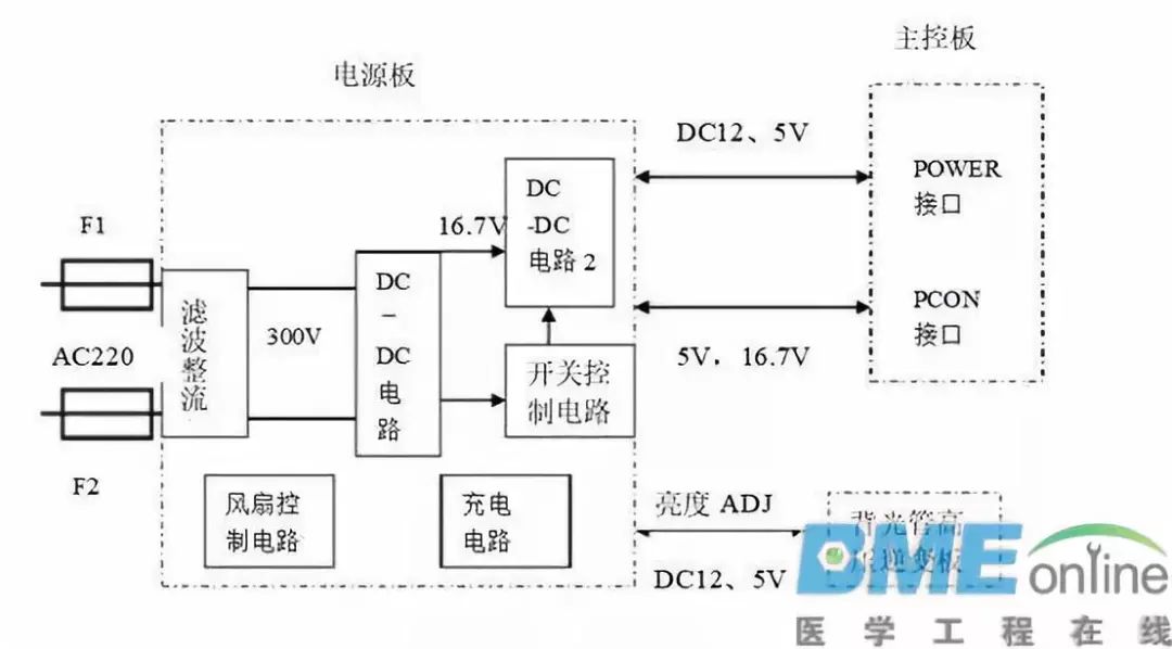 PM9000电源是一个隔离型反激式多路输出的开关电源,其电源板主要由滤波整流电路、两个DC-DC的电路、风扇控制电路、开关控制电路、充电管理电路组成;其中该电路有三路输出,分别为打印机和风扇提供12V;为背光管高压逆变板提供12V与5V;为主控板提供5V、12V。