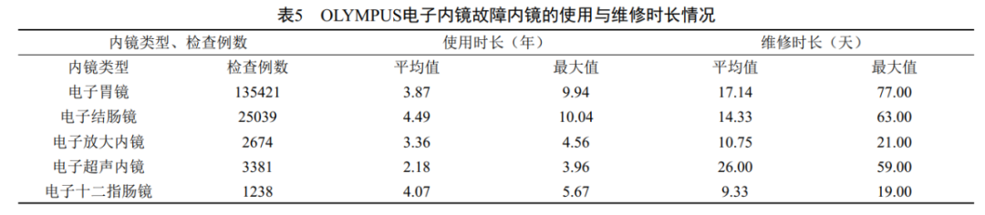 2.4故障内镜的使用与维修时长的统计分析见表5
