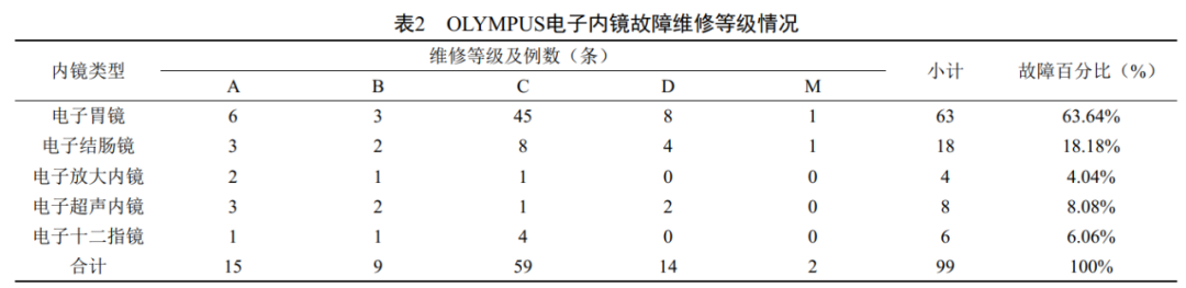内镜维修等级情况见表2,内镜维修频次与费用情况见表3。