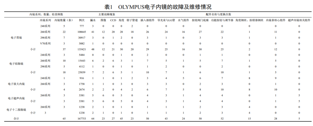 笔者医院消化内镜中心2012年1月至2017年3月期间使用OLYMPUS电子内镜共完成内镜诊疗167753例,内镜的使用、故障发生和维修资料均有档案记录。