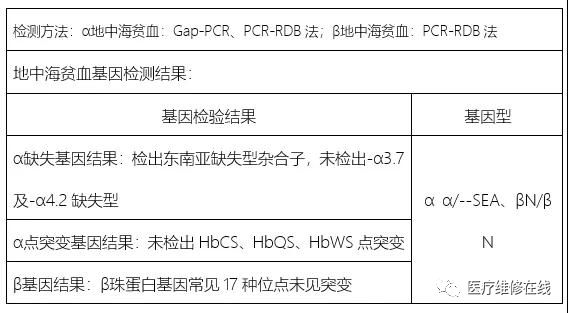 患者:男,25岁,地中海贫血基因检测结果如下表,结果表明为一例地贫患者: