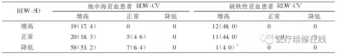 表1地中海贫血患者和缺铁性贫血患者的RDW-CV和RDW-SD结果的升高、降低情况比较