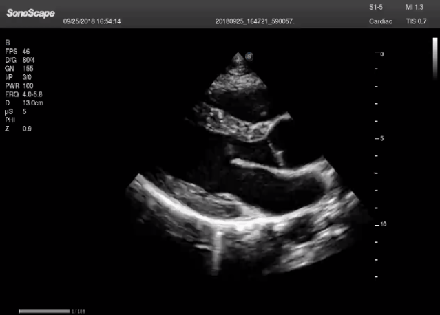 (2)摇:整个超声探头平面紧贴受检区域皮肤,以超声探头与胸壁的接触点为支点,将超声探头左右摇摆,观察整个切面。