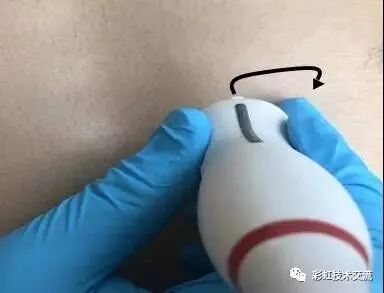 (4)转:整个超声探头平面紧贴受检区域皮肤,以超声探头与胸壁的接触点为支点,超声探头以自身中轴线顺时针或逆时针方向旋转一定角度。