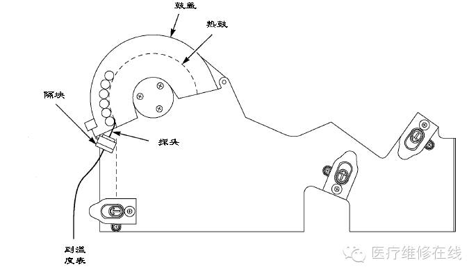 注意: 为了防止损坏热鼓的表面,请不要使用任何类型的工 具。 注意: 相机内的热鼓和滚筒都很烫。在热鼓区域内操作时 请多加小心。 2.将探头小心地放置在热鼓的中间上部。 3.关上鼓盖。 4.待温度稳定后检查温度表指示,应在摄氏123.5-124.5度之间。如实际温度不在范围内,需要做调整如下。