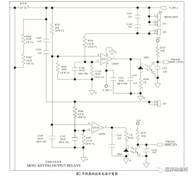 本例中,当按压闭合手控刀笔电切开关后,测得R167两端电压为0,显示-V_ISO电压并未加载到 U32 的正向输入端,而测量R166、R167阻值正常,V_ISO 电压亦为正常值 -10V左右。最终拆下前面板,发现 J25 插口处有氧化及松动现象,处理后再试机可正常工作。