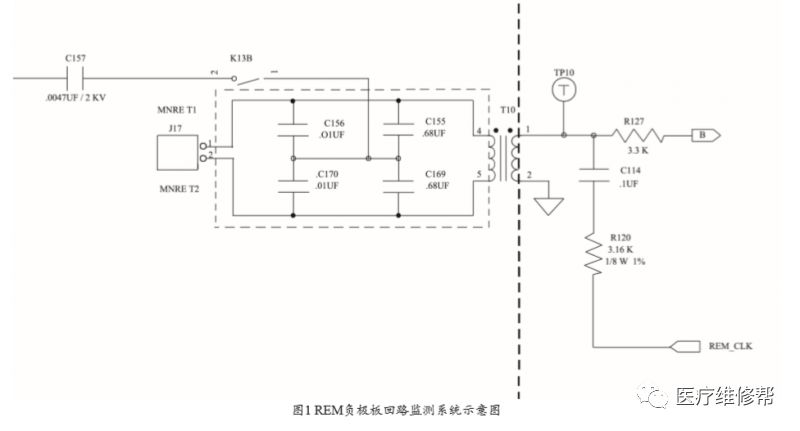 负极板校准失败,显示其内部电路还有问题。REM 负极板回路监测系统示意图,见图 1。