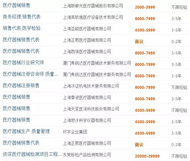 上海医疗器械各岗位综合分析,按工作经验统计(某些岗位的薪酬与工作经验并无直接关系,如销售类岗位。同时,岗位薪酬也与公司盈利情况、岗位所在公司的重要程度等因素有关。)