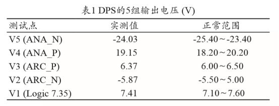 (2)在 DPS J3 接上测试盒,测量 DPS 的 5 组输出电压, 测量结果,见表 1。