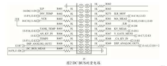 (2)测量“KV control board”的“J5”接头PIN33 与 PIN34(接地)间的电压为 2.5 V DC,而正常为 5.0 V DC(对 应 DC BUS 电压为550 V DC),更换“KV control board”, 故障仍存在。说明DC BUS 测量电路存在问题,DC BUS 测量电路,见图 2。