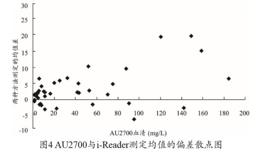 AU2700 与 i-Reader 测定均值的偏差散点图,见图4。