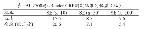 两种仪器测定血CRP 的结果具有较好的相关性,回归 方程为 y=1.0675x+0.879,R2=0.9881,AU2700 血清与 i-Reader 全血校正后回归方程为y=0.9696x+0.9252,R2=0.9987。按 CRP 项目医学重要水平点(10、50、100 mg/L)计算方法间 的系统误差,相对偏差结果,见表 1。
