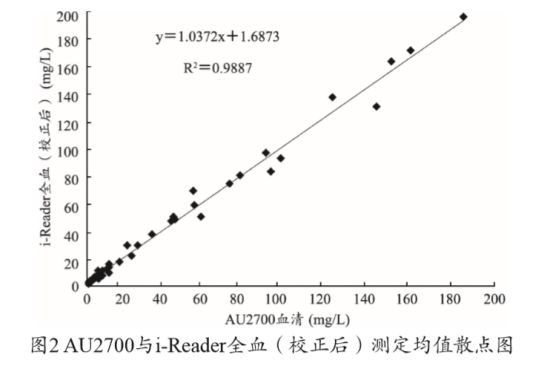 AU2700 与 i-Reader 全血(校正后)测定均值散点图,见图2。可以看出i-Reader免疫分析仪与AU2700全自动生化分析仪测定全血( 校正后) 的CRP回归方程为 y=1.0372x+1.6873,两种仪器检测值基本在一条直线上 (R2=0.9887),说明两种仪器相关性良好。