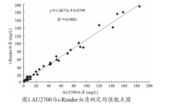 为了能给医生提供及时的诊断依据,本研究根据医学实验室认可的CLSI 文件POCT09-A 要求,采集患者末稍血作为检测全血,对本科室i-reader 干式免疫分析仪与AU2700全自动生化分析仪测定CRP结果进行比对。