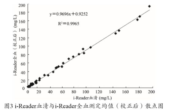 i-Reader 血清与 i-Reader 全血测定均值(校正后)散点图,见图 3。可以看出 i-Reader 免疫分析仪测定血清和全血 (校正后)CRP的散点图几乎是在一条直线上(R2=0.9965), 说明其相关性非常好。