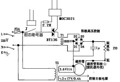 电源电路的功能是:提供磁控管的灯丝工作电源、磁控管的阳极高压电源和制系统所需的电。