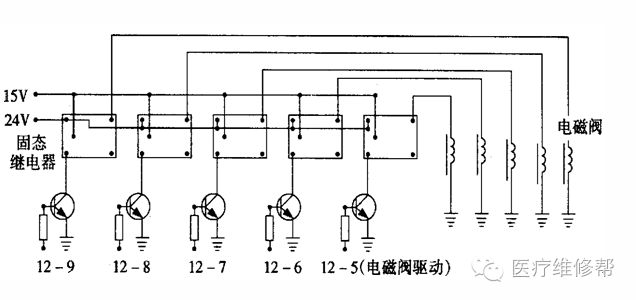 电磁阀单个不工作。此故障一般为驱动三极管及控制固态继电器损坏,先检测驱动三极管基极有无驱动信号,有则测量三极管和固态继电器,如有损坏更换。说明:此继电器为晶体管固态继电器,与普通的继电器外形相似,而内部结构不一样,它是用半导体器件代替传统电接点作为切换装置的具有继电器特性的无触点开关器件,输入端(控制端)与输出端(负载端)为光电隔离,其绝缘耐压大于1500 V,其性能大大优于传统触点继电器。不能用万用表测量其好坏。只能用代换的办法或者测量其电压关系判断是否正常。